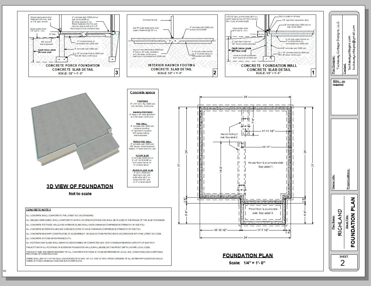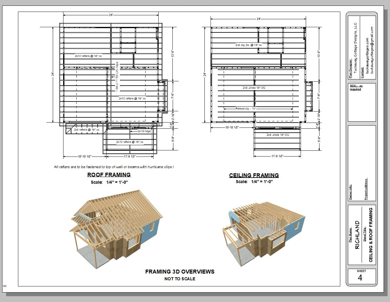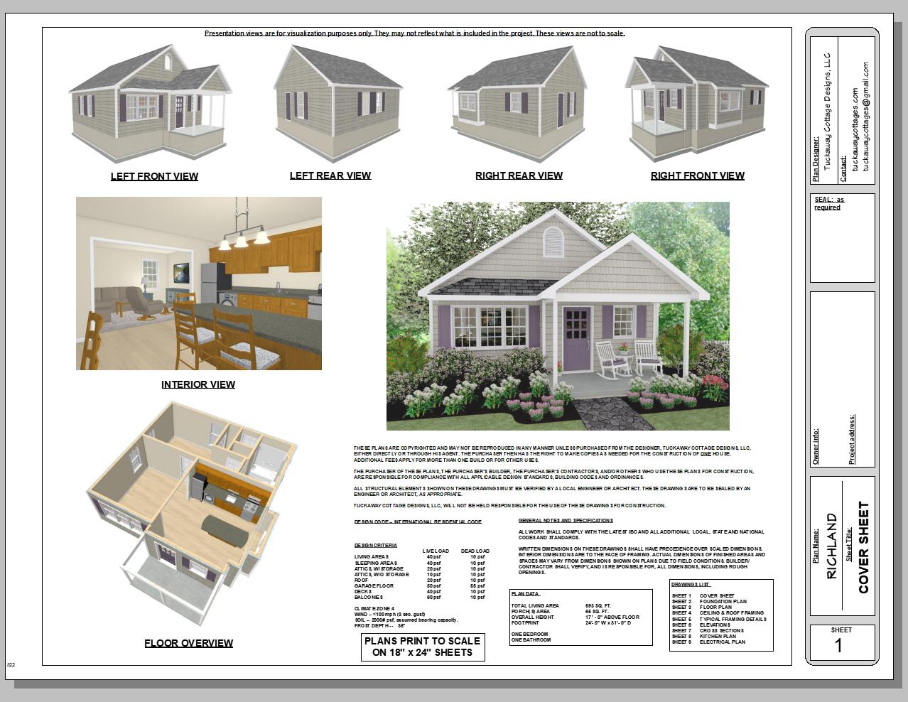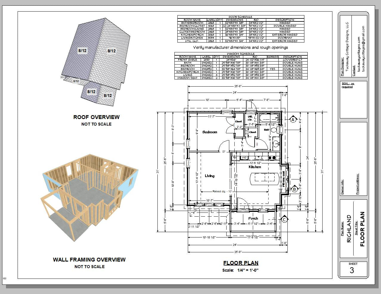 Our Full Plan set consists of 9 sheets of Arch C paper at 18" x 24". The individual sheets contain 2D and 3D views, plans, details, and notes. When you purchase our Full Plan set you will receive a link to download it as a PDF file which you may then print as needed. While you may print as many copies as needed, one plan purchase entitles you to build only one cottage.